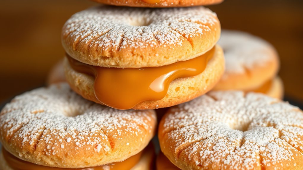 Argentine alfajores are delightful dulce de leche sandwich cookies that capture the country’s rich culinary heritage. You’ll find varieties with different cookie textures—crumbly, soft, or dense—and fillings mostly of smooth, creamy dulce de leche. Some are dipped in chocolate or dusted with powdered sugar, reflecting regional tastes. Each one tells a story of tradition, family, and regional pride. Keep exploring to discover the diverse flavors and cultural significance behind these beloved treats.