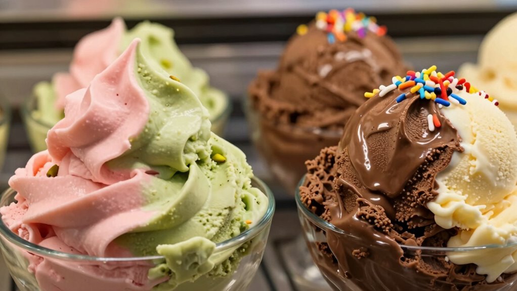 Think of gelato and ice cream as two dancers in a grand ballet. Gelato moves gracefully with a softer, more intimate touch, while ice cream performs with bold, spirited leaps. Both delight the senses, but each has its unique rhythm. When you understand their differences, you can master the dance at home, creating your own sweet performance. So, pick your partner and twirl into a world of creamy delight—your perfect frozen duet awaits.