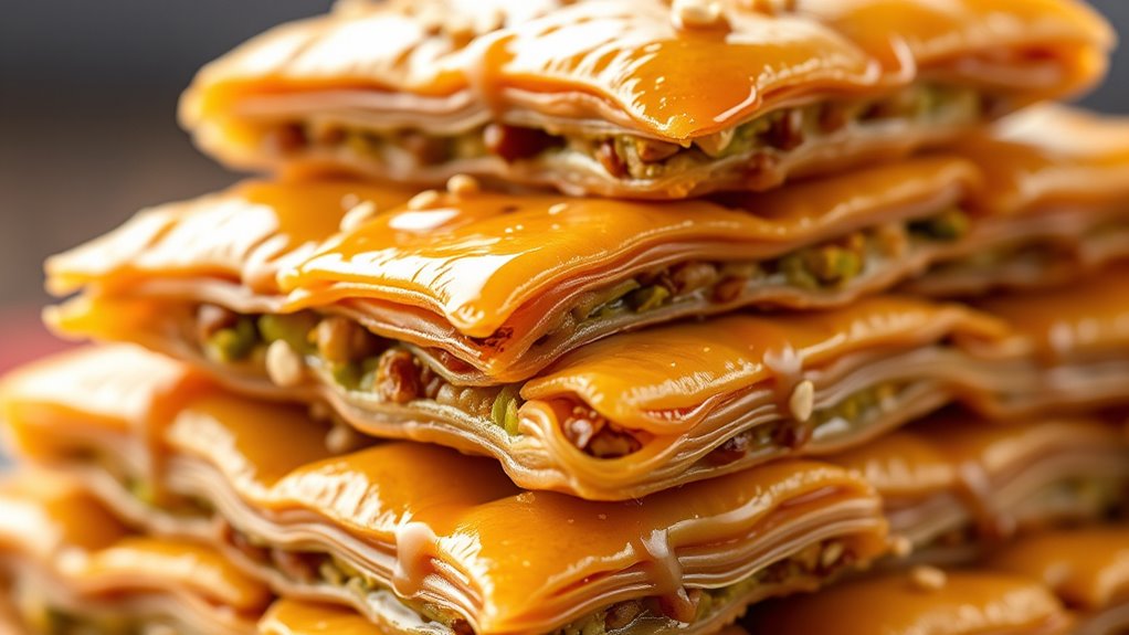 Have you ever wondered what makes baklava such a beloved dessert across the Middle East and the Mediterranean? The answer lies in its rich history, versatile ingredients, and the way it’s crafted. When you look at baklava, you’ll notice that regional variations play a significant role in shaping its unique flavors and textures. In Greece, for example, it often features walnuts and a hint of cinnamon, while in Turkey, pistachios are the star, layered between delicate phyllo sheets. Middle Eastern versions might incorporate almonds or cashews, sometimes flavored with rose or orange blossom water. These regional twists give baklava its distinct identity, reflecting local tastes and available ingredients. Despite these differences, the core appeal remains the same—a crispy, flaky pastry filled with nuts and drizzled with honey or syrup.