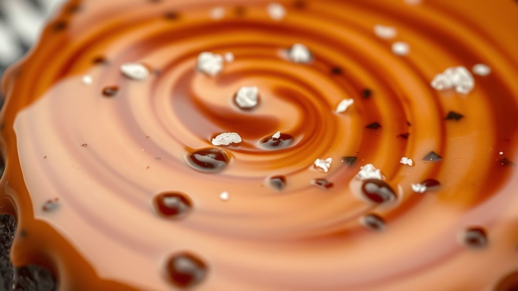 Miso caramel brings fermented umami depth to desserts, creating a rich balance of sweet and savory flavors. You combine caramel with miso, allowing fermentation to develop complex, earthy notes that enhance the overall taste. This technique transforms simple sweets into sophisticated treats with added depth and richness. If you want to discover how fermentation open up new flavor dimensions, keep exploring how miso caramel takes desserts to the next level.