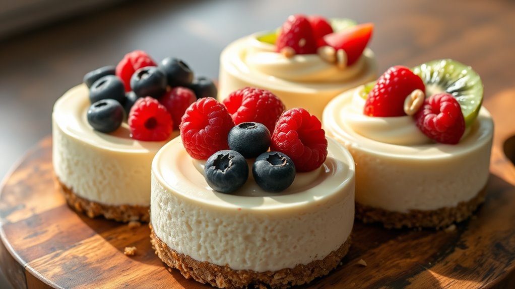 Yes, you can find gluten-free options for vegan cheesecakes. Use gluten-free crusts made from almond flour, coconut flour, or gluten-free oats. You can also incorporate alternative flours like chickpea or rice flour in the filling or crust for added flexibility. These options guarantee your cheesecake stays gluten-free, so you enjoy a delicious, allergen-friendly treat without sacrificing flavor or texture.