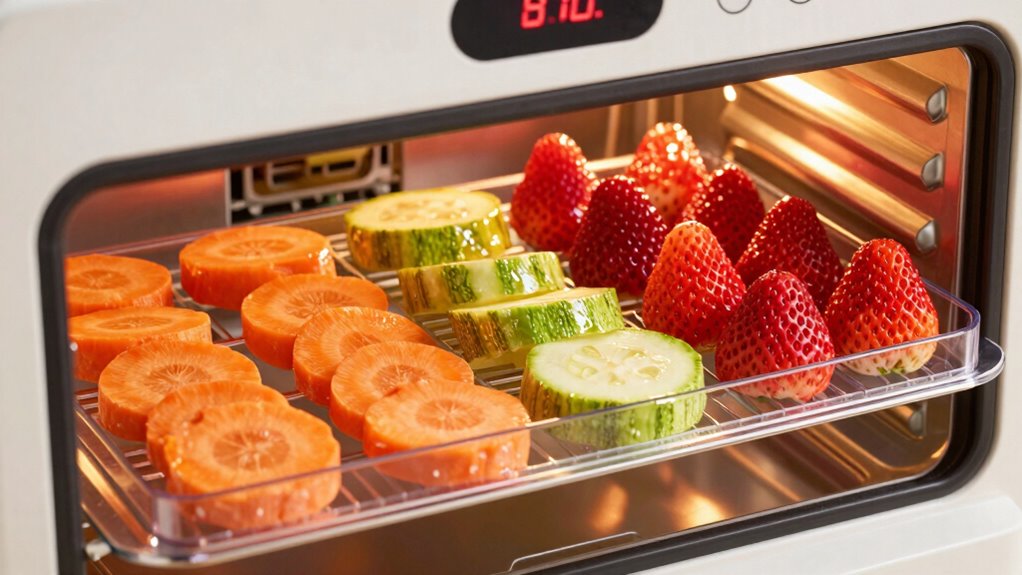 Have you ever wondered how to preserve fruits, vegetables, or herbs for longer storage? Food preservation is essential if you want to enjoy your harvest months after picking. One effective method is dehydration, which removes moisture to inhibit bacterial growth and spoilage. Mastering dehydration techniques allows you to create flavorful snacks, store seasonal produce, and even make homemade jerky. The key to success lies in understanding the right temperature settings for different foods, ensuring they dry properly without losing taste or nutrients. Proper temperature control is vital for maintaining food quality and safety during dehydration. When dehydrating fruits, you want to set your dehydrator to a temperature between 135°F and 145°F (57°C–63°C). This range is ideal because it gently removes moisture while preserving the fruit’s natural sugars, flavor, and nutrients. Thinner slices, such as apple rings or mango strips, dry faster and more evenly at these temperatures. Keep in mind that higher temperatures can lead to uneven drying or a cooked texture, so sticking to the recommended range is best. Proper food preservation through dehydration ensures your dried fruits stay chewy and sweet without becoming overly tough or brittle. Vegetables require slightly different treatment. Most vegetables are dehydrated at about 125°F to 135°F (52°C–57°C). This lower temperature helps maintain their color, texture, and nutritional value. For example, green beans or carrots should be sliced uniformly and dried until crispy but not burnt. If you apply too much heat, you risk losing vital nutrients and end up with a less appetizing product. The dehydration techniques for vegetables also include blanching beforehand, which helps preserve their color and flavor. Once dried, store them in airtight containers to maximize shelf life and retain their quality. Making jerky involves a different approach. To produce tender, safe-to-eat jerky, you should dry it at a slightly higher temperature—around 160°F (71°C)—initially to kill bacteria and parasites. Afterward, you can lower the temperature to 145°F (63°C) for the remainder of the drying process. This ensures the meat is evenly dried while maintaining safety standards. Proper dehydration techniques here involve marinating the meat beforehand, slicing it uniformly, and monitoring moisture levels regularly. The goal is to achieve a chewy, flavorful jerky that resists spoilage during storage. Understanding these temperature guidelines for dehydration is crucial for food preservation success. Whether drying fruits, vegetables, or jerky, maintaining the right temperature ensures your dried foods retain their best qualities and last longer. With proper technique and attention to detail, dehydration becomes a reliable way to enjoy your favorite produce year-round.