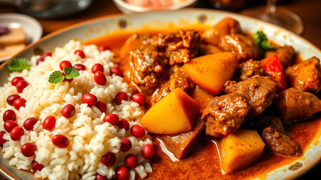 If you’re craving bold flavors and hearty comfort food, Jamaican Curry Goat and Rice & Peas are perfect choices. These dishes showcase the vibrant culinary traditions of the Caribbean, combining rich spices and time-honored cooking techniques that transform simple ingredients into extraordinary meals. When preparing Jamaican Curry Goat, understanding the importance of spice blends is key. The right mixture of turmeric, cumin, coriander, allspice, and a hint of fiery Scotch bonnet peppers creates that signature curry flavor. You’ll want to marinate the goat with these spices along with garlic, ginger, and onions, allowing the flavors to infuse deeply before cooking. This step is essential for building the complex, layered taste that makes Jamaican curry so distinctive.