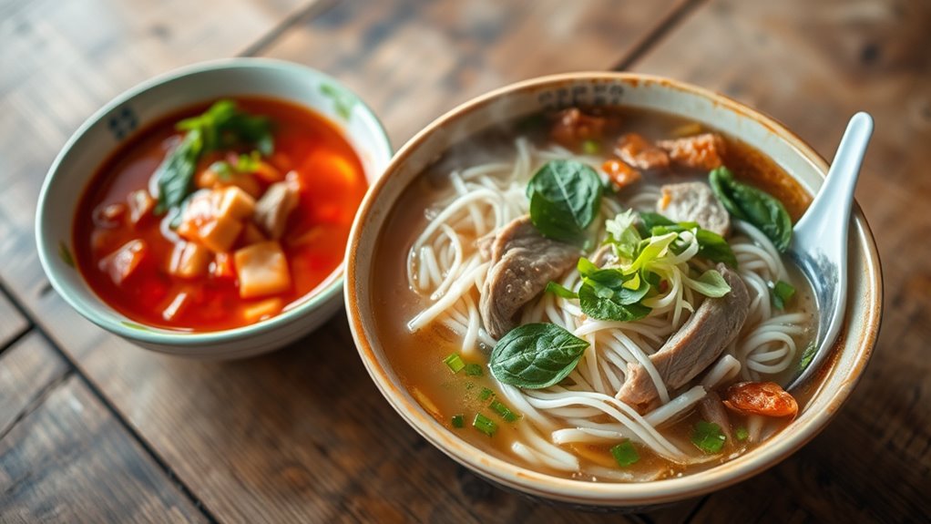 Bun Bo Hue, on the other hand, features a broth that’s more robust and spicy. Its soup ingredients include pork bones, lemongrass, shrimp paste, and chili oil, creating a distinctive, fiery flavor. The regional variations in Bun Bo Hue can be seen in the spice levels and the types of meat used—some areas favor pork, while others add beef. The broth is usually simmered longer to develop a deep, smoky taste, and the addition of fermented shrimp paste gives it a characteristic umami punch. These regional differences make Bun Bo Hue a dynamic dish that can range from mildly spicy to intensely fiery, depending on local preferences.