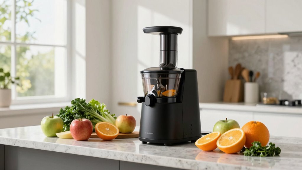 In a busy home kitchen, cold-press juicing offers a quiet, efficient process that fits into your daily routine. Its slow extraction method preserves more nutrients, which appeals to health-conscious individuals. Plus, because cold-press juicers produce less heat, they consume less electricity compared to traditional centrifugal juicers, contributing to juicing sustainability. This energy efficiency adds to the appeal of integrating cold-press juicing into your kitchen, making it a smart choice for both your health and the environment.