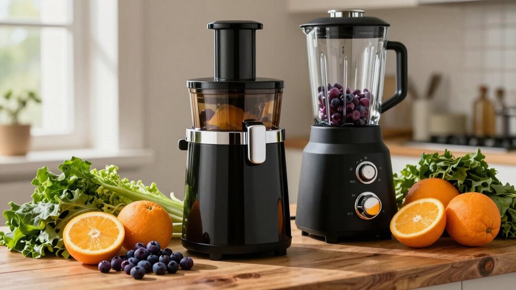 Ironically, your blender wins the race when it comes to nutrient preservation, thanks to its gentle blending process. Juicers, with their high oxidation rates, actually lose more nutrients over time because they expose juice to air. So, if you’re after maximum nutrient retention, go for the blender. It’s like saving your nutrients in a vault, while juicers leave them vulnerable to rapid oxidation.