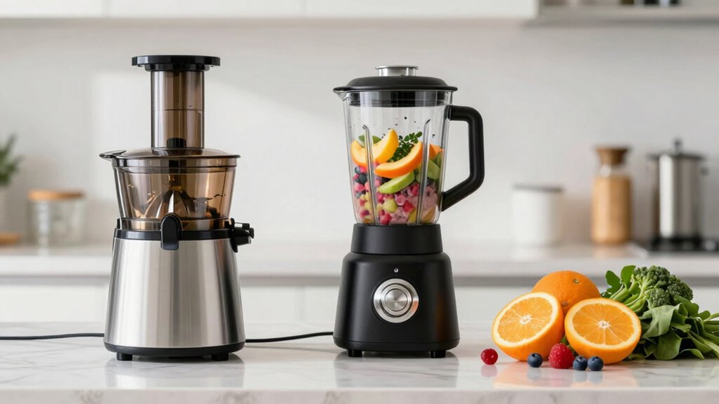 Choosing between a juicer and a blender is like deciding whether to savor a fresh, vibrant juice or indulge in a hearty, textured smoothie. If your mornings crave a quick burst of vitamins, the juicer’s sleek stream is perfect. But if you prefer a filling, fiber-rich treat, the blender’s thick, colorful blend has more substance. Ultimately, your routine shapes your choice—whether you’re chasing efficiency or craving a satisfying, textured experience.
