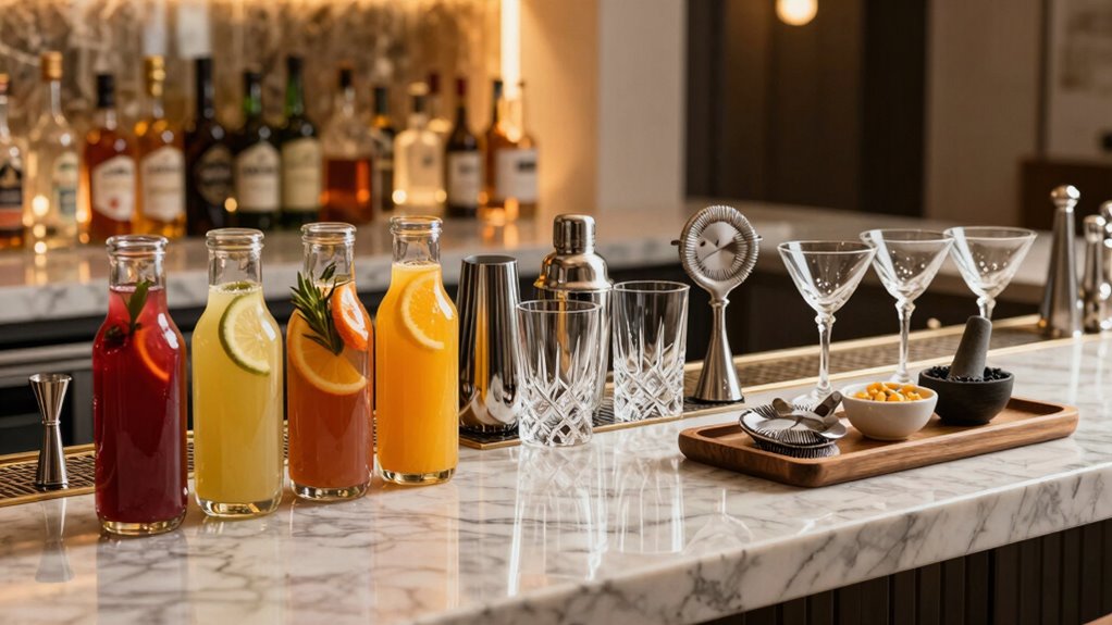 To stock your mocktail bar, you should keep fruit syrups like raspberry or mango for sweetness and vibrant flavor. Herbal infusions, such as mint or basil, add invigorating notes. Also, include fresh fruit juices, sparkling water, and tonic. By combining these ingredients, you’ll create a variety of delicious, sophisticated mocktails that mimic the complexity of cocktails, making your at-home bar feel like a real lounge.
