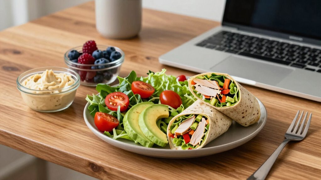 For healthy snack ideas, choose fresh fruit like apples or berries, and pack nuts or trail mix for lasting energy. Veggie sticks with hummus also make great options. Use portable snack containers to keep everything fresh and organized, ensuring your snacks stay crunchy and appetizing. These easy, healthy snacks complement your office lunch perfectly, helping you stay focused and satisfied throughout the day without relying on reheating or processed foods.