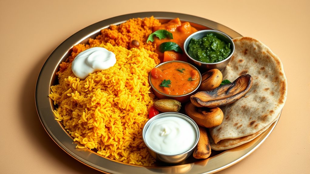Dietary adaptations also influence what goes onto your Thali. Many Thalis are vegetarian, reflecting India’s long-standing vegetarian traditions, but there are also non-vegetarian options, especially in coastal regions where seafood is prominent. If you follow specific dietary restrictions, like veganism or gluten-free diets, there are tailored Thalis that accommodate these needs without sacrificing flavor or variety. For example, vegan Thalis might emphasize lentils, vegetables, and dairy alternatives, while gluten-free versions replace wheat-based bread with millet or rice-based options. This flexibility guarantees that everyone can enjoy a balanced, nutritious meal that aligns with their lifestyle and beliefs. Additionally, the nutritional balance of a Thali is carefully maintained through the diverse components included in the platter.