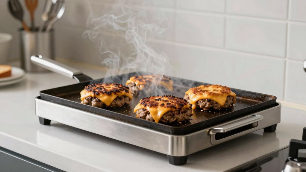 Yes, you can make smash burgers on a non-stick griddle. Its surface compatibility guarantees easy flipping and cleanup, while the non-stick coating benefits prevent burgers from sticking and tearing. Just preheat the griddle properly, use a little oil if needed, and press your burger patties flat. The non-stick surface makes cooking and cleaning simpler, letting you enjoy juicy, perfectly cooked smash burgers indoors without a mess.