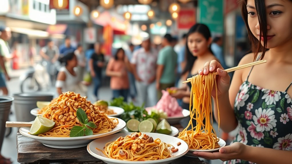 If you’re looking for an authentic and flavorful experience, a Thai street food lunch should be at the top of your list. When you bite into dishes like Pad Thai or Som Tum, you’re not just tasting food; you’re experiencing a rich cultural tradition. These dishes showcase the skillful cooking techniques that street vendors have perfected over generations. For example, when preparing Pad Thai, vendors use high heat and quick stir-frying to achieve that perfect balance of smoky aroma and tender noodles. Similarly, Som Tum, a spicy green papaya salad, requires precise pounding and tossing, blending flavors and textures in a way that highlights Thai culinary artistry. Incorporating traditional craftsmanship into each dish emphasizes the mastery and dedication involved in street food preparation. Understanding the cultural significance behind these dishes deepens your appreciation. Pad Thai, often considered Thailand’s national dish, originated as a street food during World War II to promote a sense of national identity and independence. Its popularity grew because it’s quick to prepare, affordable, and packed with flavor—making it an ideal meal for busy streets. Som Tum, on the other hand, has roots in Northeastern Thailand and reflects the region’s agricultural traditions. It’s a symbol of community and resourcefulness, utilizing fresh, locally available ingredients like green papaya, chilies, and lime. When you order these dishes from street vendors, you’re participating in a culinary legacy that connects generations and regions. The vibrant street food culture in Thailand emphasizes the importance of fresh ingredients and bold flavors, but it also highlights the craftsmanship behind each dish. Vendors often prepare these meals right in front of you, demonstrating a mastery of cooking techniques that have been refined over decades. Watching a vendor toss Pad Thai in a hot wok or pound Som Tum with a wooden mortar reveals their skill and understanding of flavor balance. These techniques aren’t just about cooking; they’re about preserving tradition and passing down cultural values through food. Eating street food in Thailand gives you a glimpse into the daily lives and history of its people. The bustling markets and street stalls are alive with activity, each dish telling a story of regional identity and shared heritage. When you indulge in a quick, tasty lunch of Pad Thai or Som Tum, you’re connecting with a culture that values community, craftsmanship, and the joy of good food. So, next time you find yourself in Thailand, embrace the street food scene—you’re not just eating; you’re experiencing an essential part of Thai life.