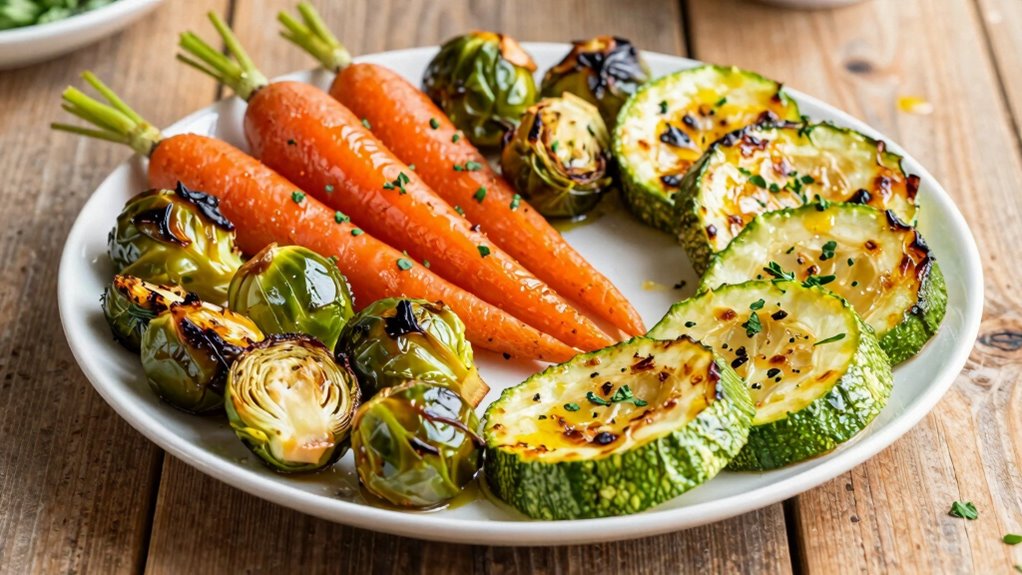 To reheat roasted vegetables without losing flavor, use gentle reheating techniques. You can warm them in a skillet over low heat, stirring occasionally, or reheat in the oven at 350°F for about 10 minutes, which helps preserve their flavor and texture. Avoid microwaving for too long, as it can make vegetables soggy and diminish their taste. These methods guarantee your roasted vegetables stay delicious and flavorful for your lunch.