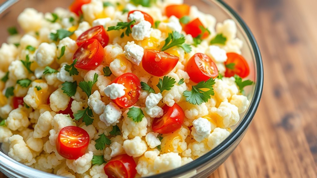 By choosing cauliflower couscous salads, you’re embracing a tasty, low-carb alternative that’s packed with fiber and nutrients. Did you know that increasing vegetable intake can reduce your risk of heart disease by up to 30%? So, next time you crave a flavorful, healthy dish, reach for cauliflower couscous. It’s a simple swap that can make a big difference in your wellness journey—delicious, nutritious, and easy to prepare.