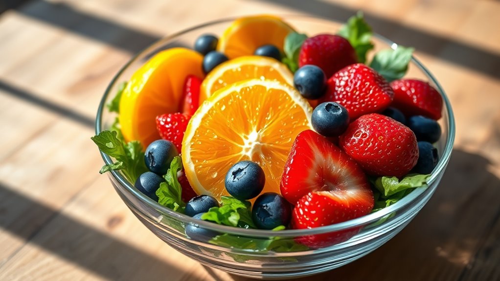 To create a colorful and nutritious fruit-based salad with citrus, berries, and greens, combine fresh, seasonal ingredients like oranges, strawberries, and spinach for vibrant flavor and texture. Balance sweet and tart flavors, and add crunch with nuts or seeds. Use appealing presentation techniques such as layering and garnishing with mint or basil to enhance visual appeal. Keep exploring for more tips on making your salad even more delicious and eye-catching.
