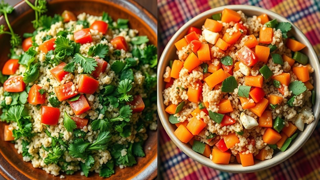 Ultimately, your experience with these salads will reveal their cultural distinctions through herb variations and serving styles. Lebanese Tabbouleh’s focus on parsley and meticulous presentation contrasts with Brazilian Tabule’s broader herb mix and relaxed, versatile serving approach. Each offers a unique taste of its region’s culinary identity, showcasing how a simple dish can embody diverse traditions and flavor profiles.