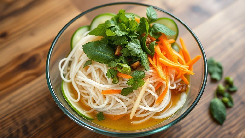 Ever wonder which herbs truly elevate Vietnamese noodle salads? You should know that cilantro, mint, Thai basil, and perilla are the traditional herbs used. These herbs create a vibrant herbal pairing that enhances regional variations across Vietnam. They add freshness and aroma, making each bite more flavorful. Incorporate these herbs to stay authentic or experiment with regional twists, and you’ll craft a salad bursting with authentic Vietnamese flavor.