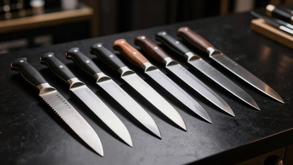 To guarantee your bread knife stays sharp and performs reliably, it’s essential to take into account the steel quality and heat treatment process during manufacturing. High-carbon stainless steel blades typically hold their edge longer than softer steel alloys, reducing the need for frequent resharpening. Resharpenable blades also extend the lifespan of your knife by allowing easy maintenance, ensuring consistent cutting performance over time. Proper care, such as hand washing and avoiding dishwashers, plays a crucial role in preserving sharpness and preventing corrosion. Remember, a well-treated blade with quality steel and heat treatment will stay sharp longer, making your slicing tasks easier and more precise. Investing in these factors guarantees your bread knife remains a reliable tool for years to come.