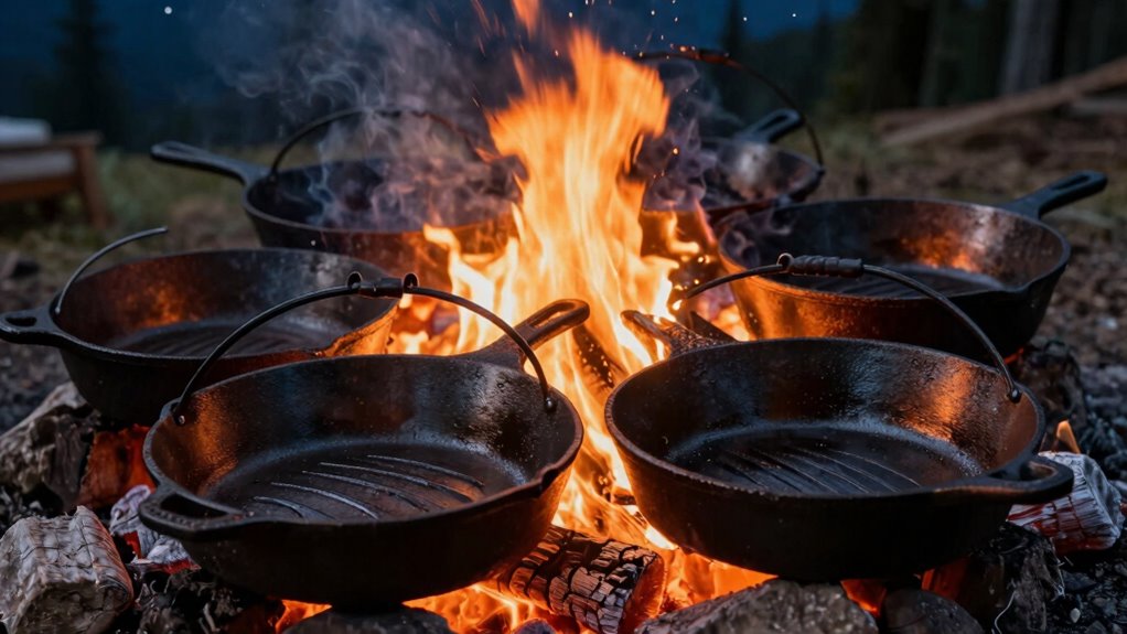 Absolutely, you can use your cast iron skillet on a camping open fire. I love tossing mine right onto the flames—it heats evenly and adds a smoky touch. Just be sure to handle it carefully with heat-resistant gloves and avoid sudden temperature changes to prevent cracking. Afterward, I let it cool naturally and clean it thoroughly. It’s a timeless way to cook, bringing out flavors like nothing else.