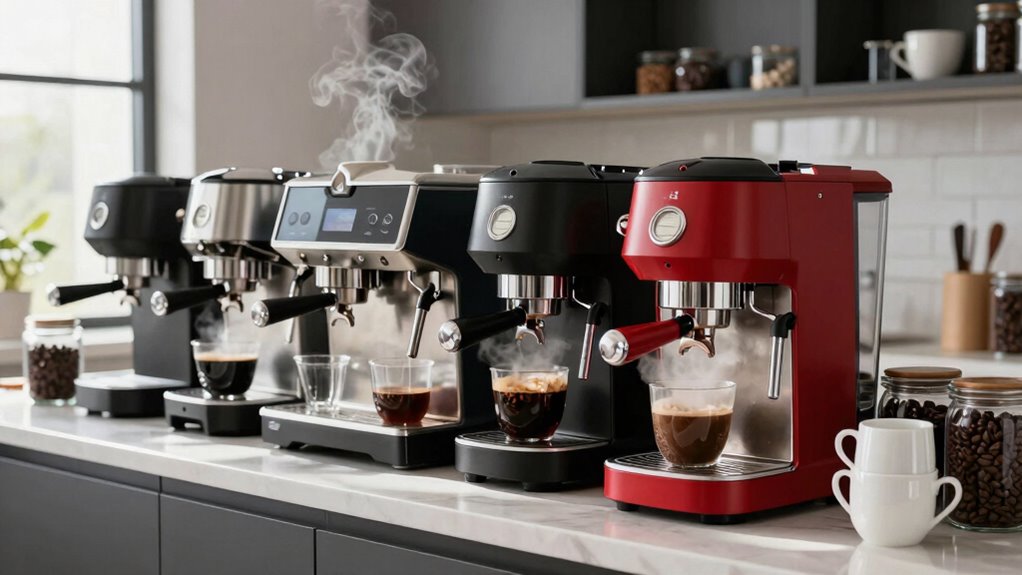 Think of a busy morning where safety is your top priority—these coffee makers include features like auto-shutoff and child-locks, preventing accidents when everyone’s rushing. I’ve found these safeguards give me peace of mind, especially with kids around. They’re designed to handle the chaos of a hectic family life, ensuring safety without sacrificing convenience. Trust me, these thoughtful touches make a real difference in keeping my home secure.