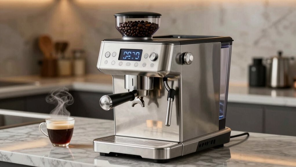 To keep your built-in grinder clean, I recommend regularly running a grind cycle with just water or a grinder cleaner to remove oils and buildup. I also wipe down the hopper and burrs with a damp cloth weekly. Avoid using harsh chemicals, and always follow your machine’s manual for specific cleaning instructions. Regular maintenance guarantees fresh-tasting coffee and prolongs your machine’s lifespan.