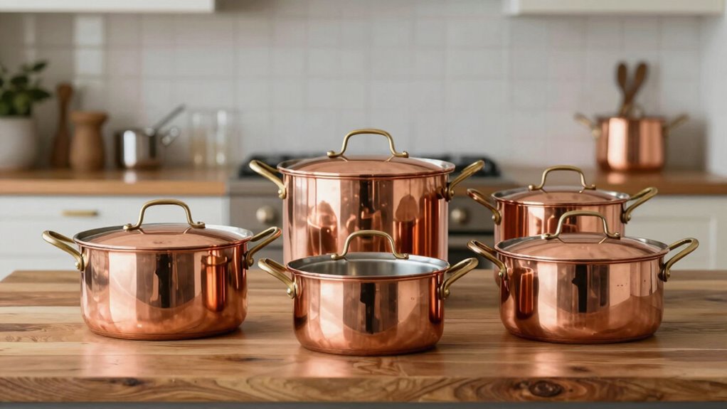Beyond durability, the visual appeal of copper cookware sets plays a significant role in choosing the right pieces for your kitchen. Copper’s vibrant, shiny finish instantly adds a touch of luxury, making your space feel more refined. The polished surface and craftsmanship often feature stylish details like brass handles or decorative edges, enhancing their decorative value. Over time, copper naturally develops a patina, giving each piece a distinctive, antique look, which can be preserved or polished for a brighter shine. Its versatility allows it to complement both modern and traditional kitchen styles seamlessly. Whether you prefer a sleek, contemporary aesthetic or a vintage vibe, copper cookware elevates your decor while remaining functional, making it a truly eye-catching addition.