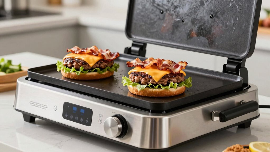 Ever wondered how to keep your griddle in top shape? For nonstick surfaces, I recommend wiping with a soft cloth and mild soap, avoiding abrasive scrubbers. With cast iron, I guarantee it’s hot, then scrape off residue, rinse, and dry thoroughly to prevent rust. Do you see how proper cleaning extends your griddle’s lifespan? Regular maintenance keeps your cooking surfaces pristine and ready for perfect smash burgers every time.
