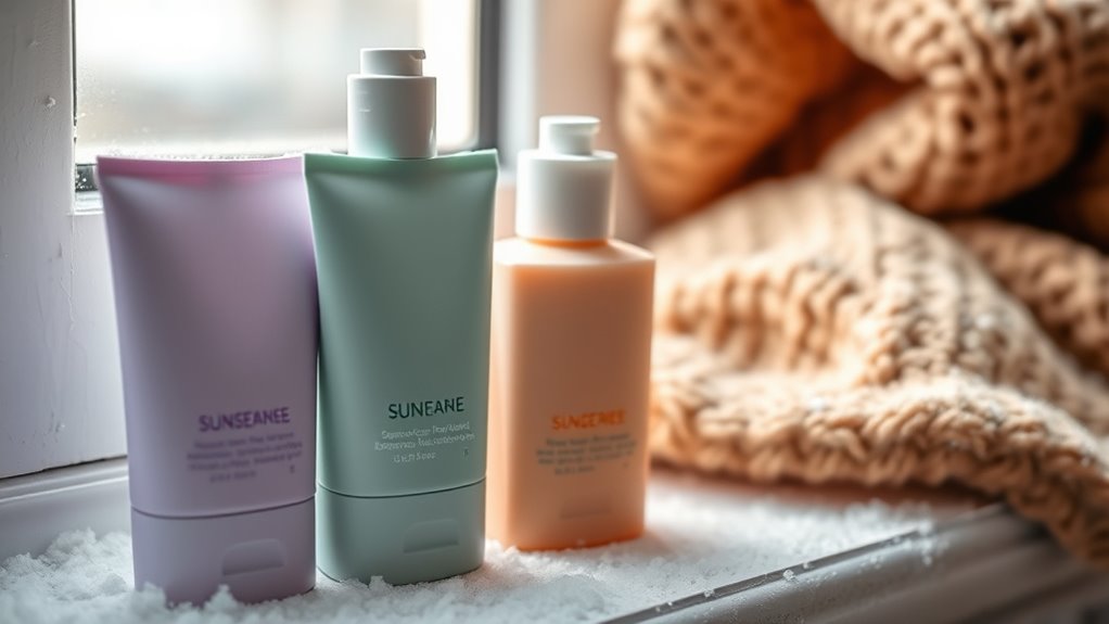 You should reapply sunscreen every two hours during winter days, especially if you’re outdoors or near reflective surfaces like snow. Even in cold weather, UV rays can damage your skin, so staying protected is essential. I make it a habit to reapply after sweating or wiping my face, ensuring continuous coverage. Don’t forget to choose a broad-spectrum sunscreen suitable for winter conditions to keep your skin safe and healthy.