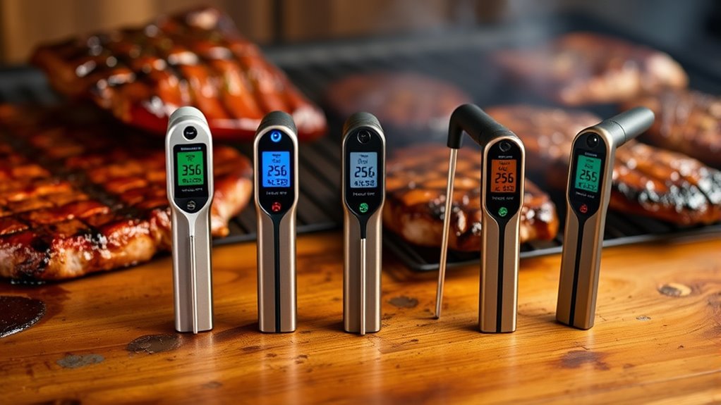Selecting a meat thermometer with the right temperature range is indispensable for accurate grilling. You want a device that can measure above the highest internal temperature of your meat, usually up to 212°F, to ensure doneness without guesswork. For high-heat grilling or searing, look for thermometers that can handle ambient temperatures up to at least 527°F. A broader range adds versatility, allowing you to monitor smoking, roasting, or frying. Quick response times are crucial, so choose a thermometer with sensors that respond within seconds for real-time accuracy. If you often cook different types of food, consider dual sensors to track both internal and ambient temperatures simultaneously. This flexibility helps you achieve perfect results every time.