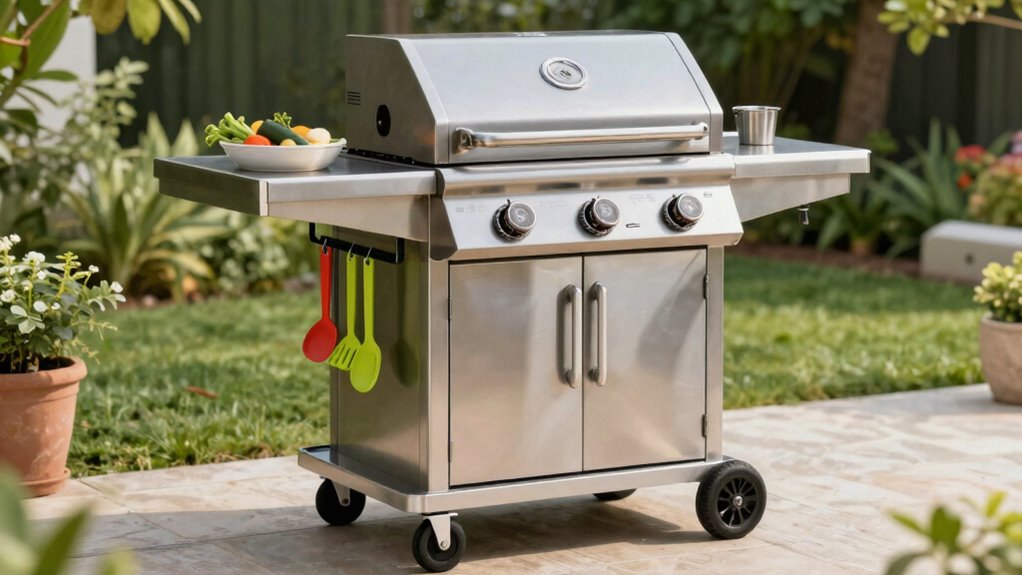 Did you know that nearly 70% of consumers prefer eco-friendly products? I’ve found that there are great eco-friendly options for outdoor grill cart materials, like recycled steel, reclaimed wood, and bamboo. These choices not only help reduce environmental impact but also add a unique, rustic charm to your outdoor space. I recommend exploring brands that prioritize sustainable materials—they’re stylish, durable, and good for the planet.