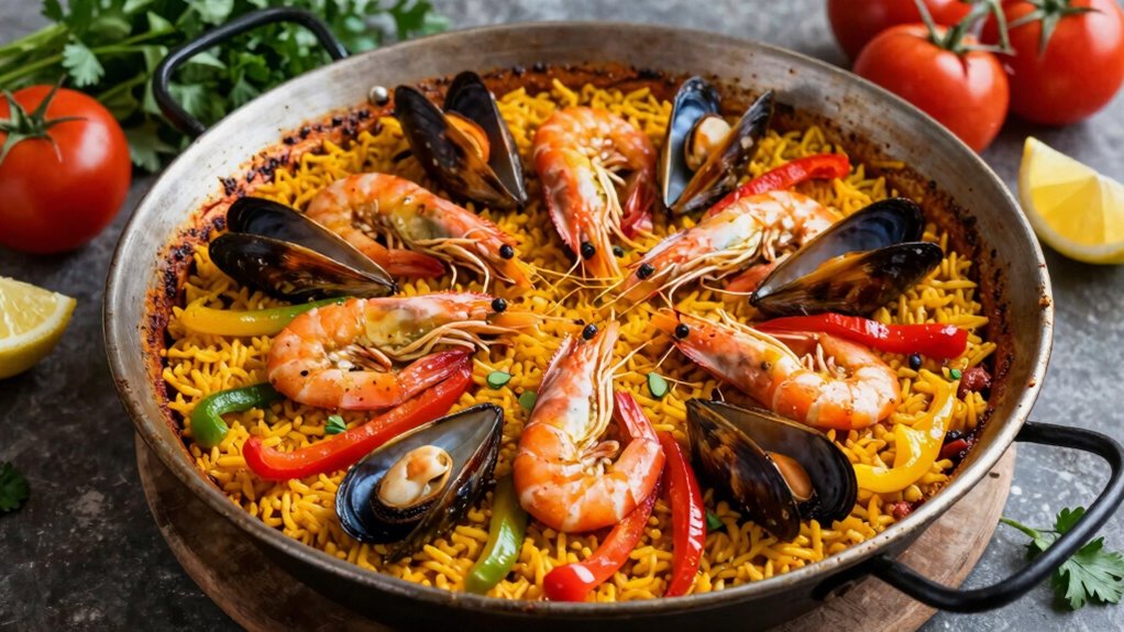 To keep my large stainless steel paella pan in top shape, I clean it right after use with warm water and a gentle sponge, avoiding harsh abrasives. I occasionally use a mixture of baking soda and water to remove stubborn stains. To maintain its shine, I dry it thoroughly and apply a light coat of oil. Regular maintenance helps prevent rust and keeps my pan performing like new.