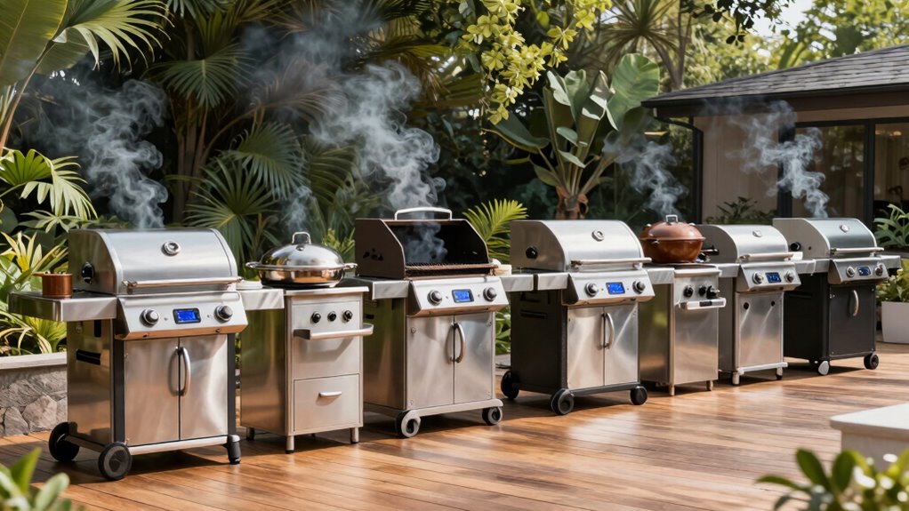 If you’re looking for the 15 best pellet grill smoker combos for 2026, I’ve got you covered. I’ve researched models with top features like advanced PID temperature controls, high build quality, versatility for multiple cooking styles, and great capacity for large gatherings. Many include Wi-Fi or Bluetooth connectivity for easy monitoring, and portable options for outdoor adventures. Keep going, and I’ll share insights on what makes each stand out and how to choose the right one for you.