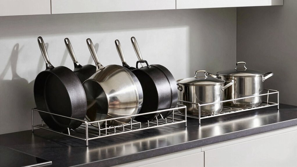 Protecting your cookware during storage is just as important as selecting the right pots and pans. Heavy-duty organizers with anti-scratch coatings help prevent surface damage, keeping your cookware looking new. Metal racks with scratch-resistant finishes maintain their appearance while shielding pots and pans from scuffs and abrasions. Some organizers include cushioned or rubberized dividers that create a protective barrier between cookware and the rack, reducing the risk of chips or scratches. Proper surface protection features are especially vital for heavy items like cast iron, ensuring they stay free from scratches and chips over time. Choosing organizers with these protective coatings or padding not only preserves the aesthetic quality of your cookware but also extends its lifespan, making your investment last longer.