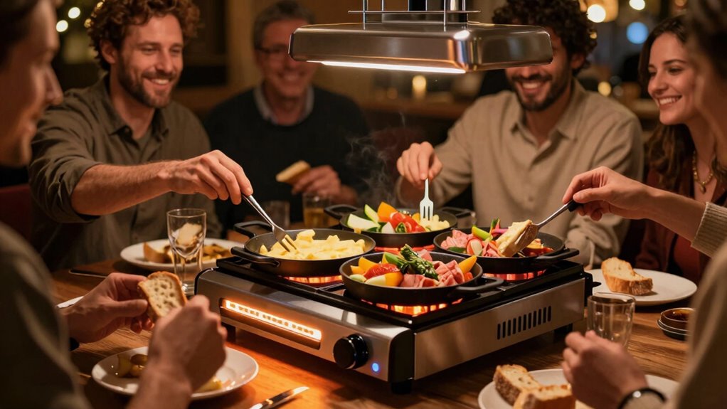 The versatility of a raclette grill can considerably enhance your party experience by expanding the variety of dishes you can prepare simultaneously. Reversible or multi-surface plates allow you to grill meats, vegetables, and seafood, as well as cook pancakes, eggs, and crepes, making it a multi-functional kitchen tool. Cheese pans and trays are great for melting cheese directly on your dishes, adding flavor and variety. Adjustable temperature controls give you precise cooking, whether searing steaks or gently melting cheese. Some models feature dual-zone or multi-layer surfaces, letting you prepare different foods at varying heat levels at the same time. Additional features like stone grilling or crepe attachments further broaden your culinary options, making your raclette grill a versatile centerpiece for any party.