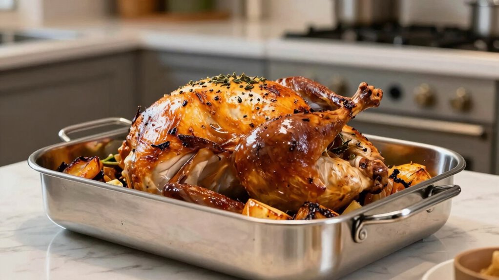 Nonstick coatings in roasting pans can make a big difference when it comes to handling turkey, as they allow for easy food release and quicker cleanup. High-quality nonstick surfaces, often PTFE or PFOA-free, ensure safer cooking and make cleaning much simpler. However, these coatings can wear down over time, especially if you use metal utensils or abrasive scrubbers, which can impact their performance. To prolong the lifespan of the coating, it’s best to pre-season your pan and wash it gently—hand washing or using a gentle dishwasher cycle helps preserve the nonstick surface. Keep in mind that once the coating begins to degrade, food may stick more, making cleanup more difficult. Choosing a pan with durable nonstick properties can save you time and effort during turkey preparation.
