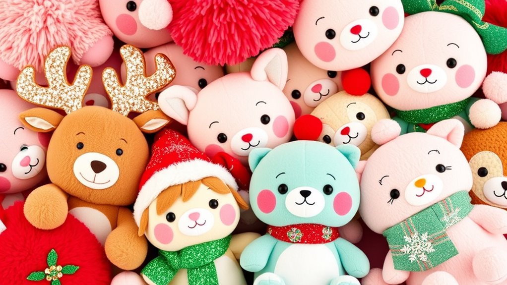 If you’re looking for the top Squishmallows for the 2025 holiday season, I recommend checking out limited editions like the Ernesto Christmas Peppermint Latte Elf, Ignacio Snowman, and Emmy Christmas Elf, all around 8 to 10 inches. Plus, there are adorable mini plushes, such as the holiday countdown calendar with 24 mini Squishmallows, and classic favorites like Rudolph and the Grinch. Keep exploring to find these festive must-haves and learn more about what makes them special.
