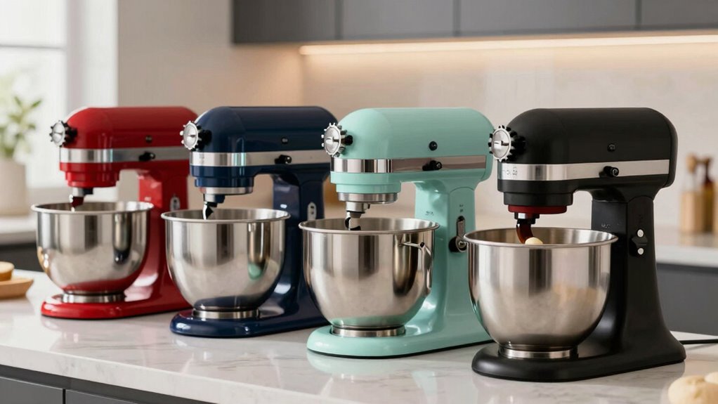 Think of stand mixers as versatile chefs in disguise—they don’t all come with the same toolkit. Not every mixer includes bread-making attachments like dough hooks or whisks. Some models require you to buy these accessories separately, turning your kitchen into a culinary playground. So, if bread baking is your passion, double-check the package to guarantee it’s equipped with the right attachments before making your choice.