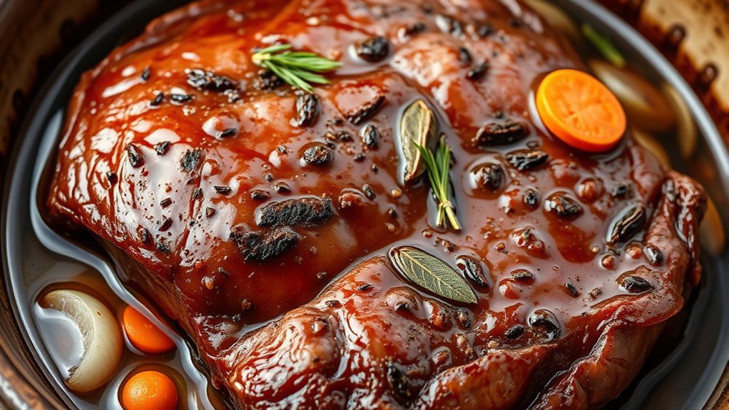 As the marinade interacts with the meat, the proteins begin to denature, changing their structure and tenderness. You’ll also notice how flavor molecules bind to these proteins, enhancing the overall taste. Understanding these interactions helps you perfect the marination process for a juicier, more flavorful Sauerbraten.