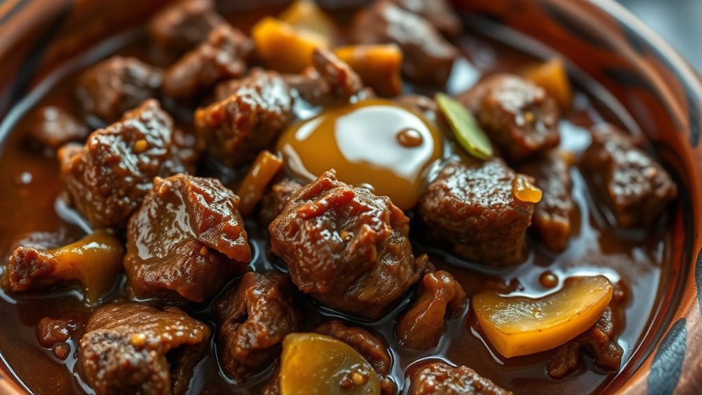 Achieving the perfect dry texture in rendang requires careful attention to cooking time. You need to simmer the beef slowly over low heat, allowing moisture to evaporate gradually. Rushing this process can leave the dish too moist, while overcooking risks burning the spices and meat. Monitor the pot regularly, stirring occasionally to prevent sticking and ensure even cooking. The key is patience—cooking too quickly preserves excess liquid, while prolonged simmering helps achieve that characteristic dry, tender consistency. Trust your senses; as the sauce thickens and clings to the meat, you’ll know it’s nearing perfection. Keep the heat low, and don’t rush the process. Proper timing guarantees that your rendang develops its rich flavor and ideal dry texture.