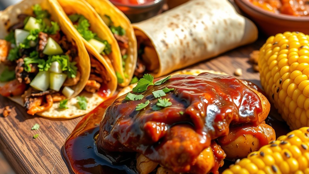 You’ll notice regional taco styles vary greatly across Mexico, each with distinct tortilla types and fillings. In Baja, fish tacos wrapped in soft corn tortillas are popular, while in Oaxaca, tacos often feature rich moles with thick corn tortillas. In Yucatán, you might try cochinita pibil tacos on banana leaf-wrapped tortillas. These regional variations showcase local ingredients, flavors, and traditional methods, making each taco experience uniquely Mexican.